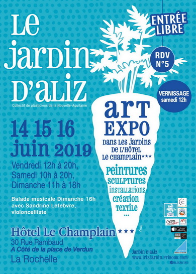 Le Jardin d'Aliz La Rochelle, du 14 au 16 juin 2019Exposition à l'hôtel Le Champlain, 30 rue Rambaud |